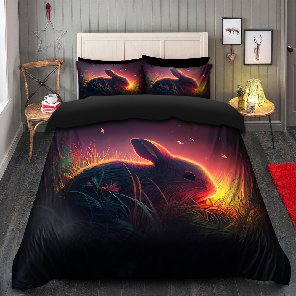 Cute Rabbit Bedded Down In The Grass Safe And Cozy Fireflies Bedding Set Duvet Cover And 2 Pillowcases